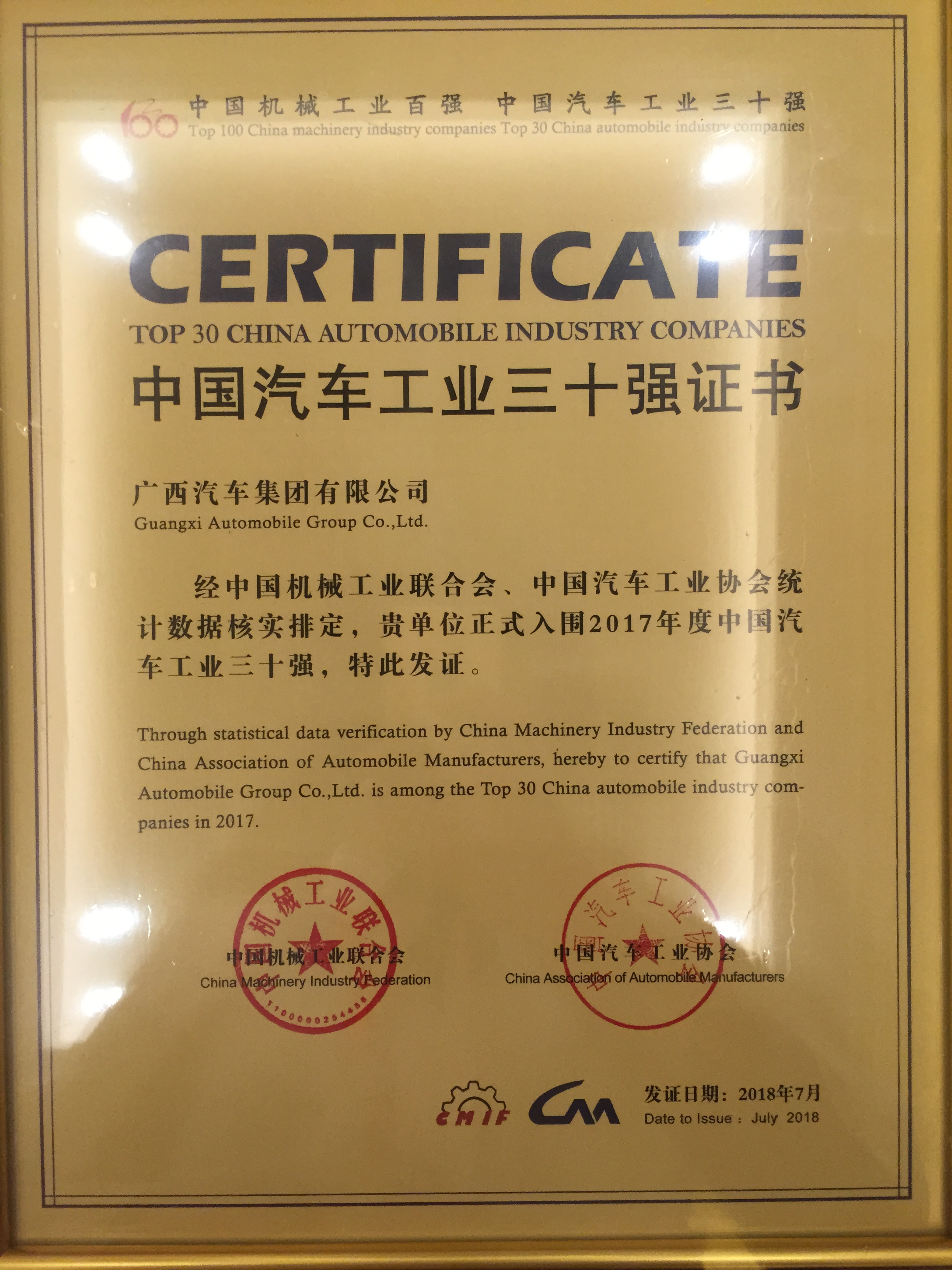 2018年7月13日,由中國機械工業(yè)聯(lián)合會、中國汽車工業(yè)協(xié)會聯(lián)合組織開展的“2017年中國機械工業(yè)百強企業(yè)、汽車工業(yè)30強企業(yè)”榜單揭曉并正式向社會發(fā)布,廣西汽車集團公司以2017年度營業(yè)收入220億元榮登“2017中國汽車工業(yè)30強企業(yè)”榜單,排名第21位,集團已連續(xù)10年躋身“中國汽車工業(yè)30強企業(yè)”行列。